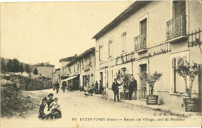 Eyzin-Pinet a fait l’objet de nombreuses cartes postales. Celle-ci montre l’entrée du village du côté de la route de Meyssiez. Cette carte a circulé : elle a été écrite le 1er janvier 1918, dans un contexte historique tragique. Voici quelques extraits, avec l’orthographe originale : « Chers amis. Je vous envois cette petite carte pour venir souhaiter une bonne et heureuse année et espérer que ce fléau de guerre finira bientôt et qu’on pourra rentrer dans ses foyers (…) Bien chers amis je vous dirais que je suis en permission pour les fêtes du jour de l’an mais c’est pas long car il faut que je reparte maintenant par la neige... »